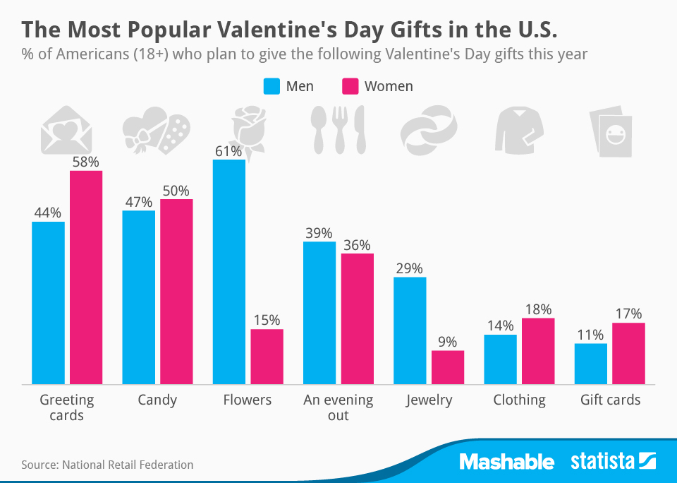 Statista has created a chart summarizing the findings of the study conducted by the National Retail Federation to identify the most popular Valentine’s Day gifts in the U.S.: