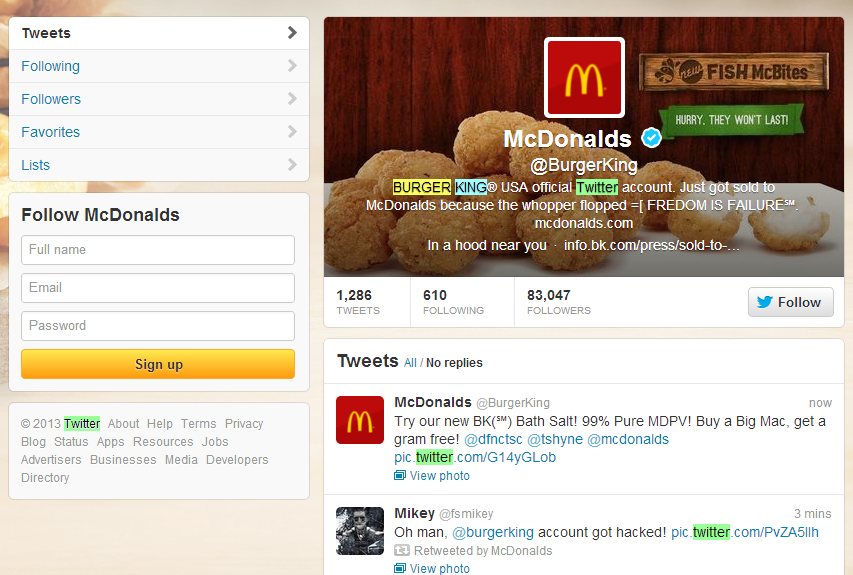 Burger King is trending on Twitter this morning, but not due to any of the company's own publicity efforts. The fast food chain's twitter account was hacked not long after 9:00 AM Pacific time, when the hackers changed the account name and avatar to McDonald's and began a stream of offensive tweets that lasted over an hour before the account was suspended. It's unclear at this time who the hackers are, but the account has gained over 20,000 followers since the attack began.