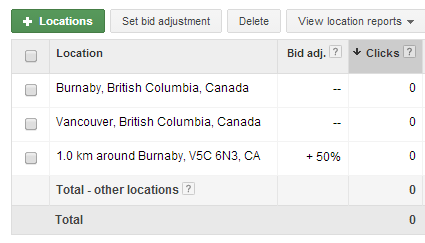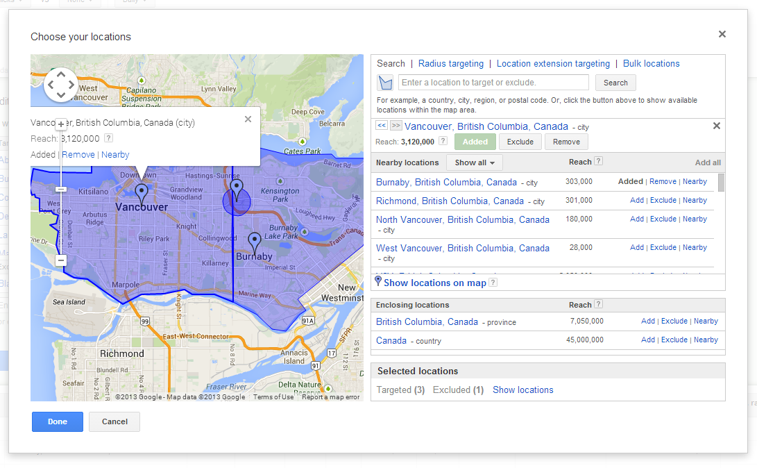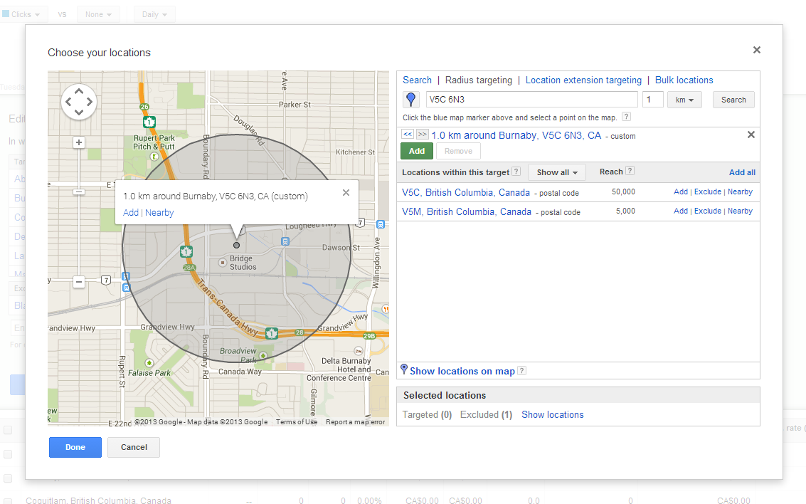 Here I chose Vancouver and Burnaby. To target customer close to your store specifically, on the window above, go to Radius Targeting and enter the postal code of your store, as well as the radius of the zone targeted, as you can see below:Go back to your location setting and set a bid multiplier for this area, i.e. how much more are you willing to pay to attract potential customers in this area: