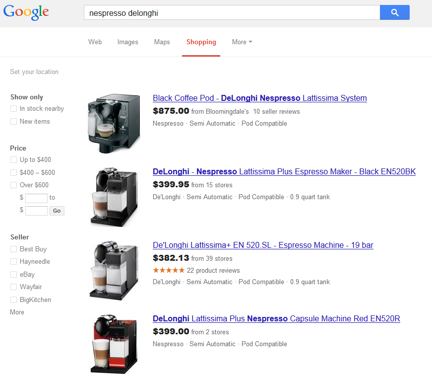 Note that your product ads will not only be displayed in Google search results page, but also in Google Shopping, as seen below:
