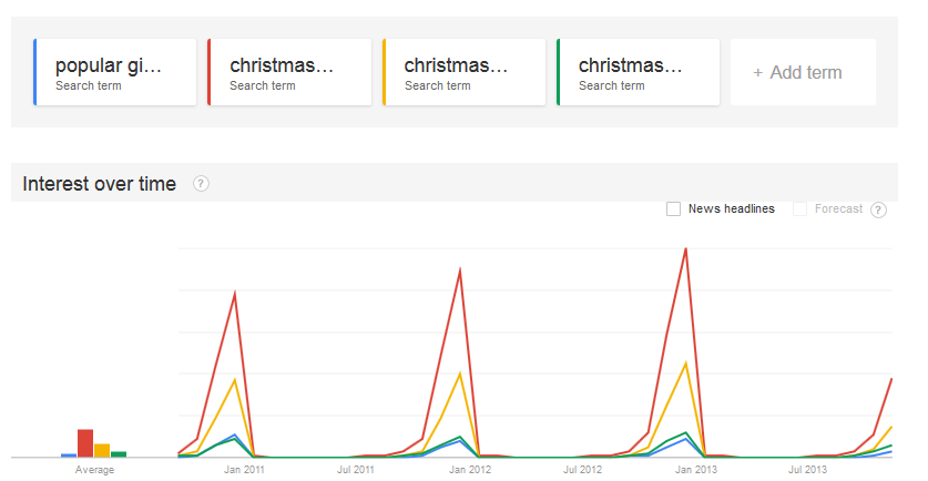 Below, the Google trends chart shows this trend repeated for other similar keywords such as: “popular gift for Christmas”, “Christmas gift for men”, “Christmas gift for women” and “Christmas gift guide”: -