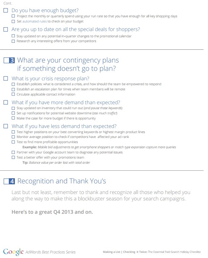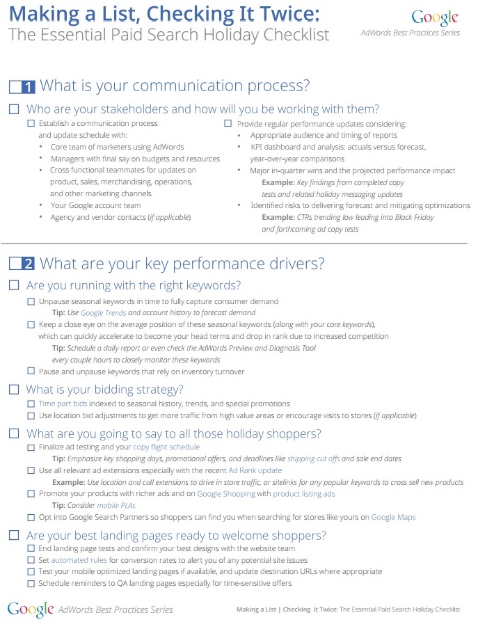 Google today released a checklist for advertisers to effectively run AdWords campaigns this Christmas. The checklist contains 4 main parts with multiple subparts undereach section. The checklist allows you to ensure your bidding strategy is suitable, keywords are correct, and landing pages are optimized.