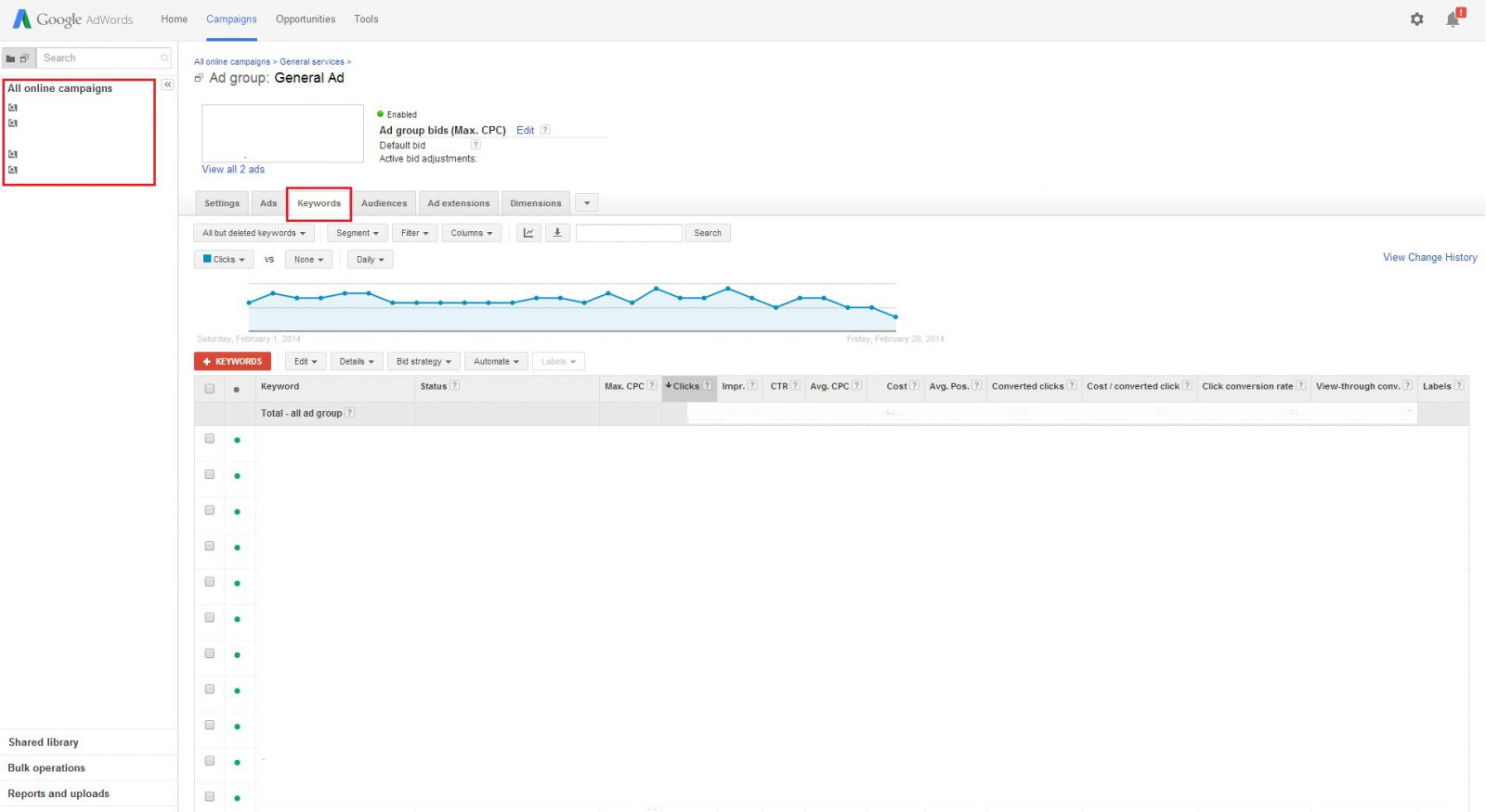 Originally called the Search Query Performance report, the Search Term report in Google Analytics is accessible from the Keyword tab accessible for each campaign or ad group, as seen below: