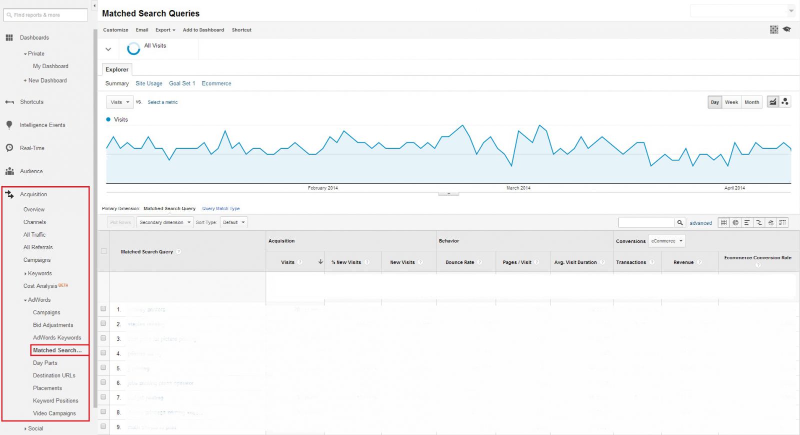 One of the simplest ways to access paid search clicks search query data in Google Analytics was to use the Paid Search Traffic report, accessible in Acquisition > AdWords > Matched Search Queries. The report displays metrics such as the number of visits, the % of new visits, the bounce rate or average visits duration for each keyword that drove traffic to website, as seen below (data has been hidden for privacy concerns):