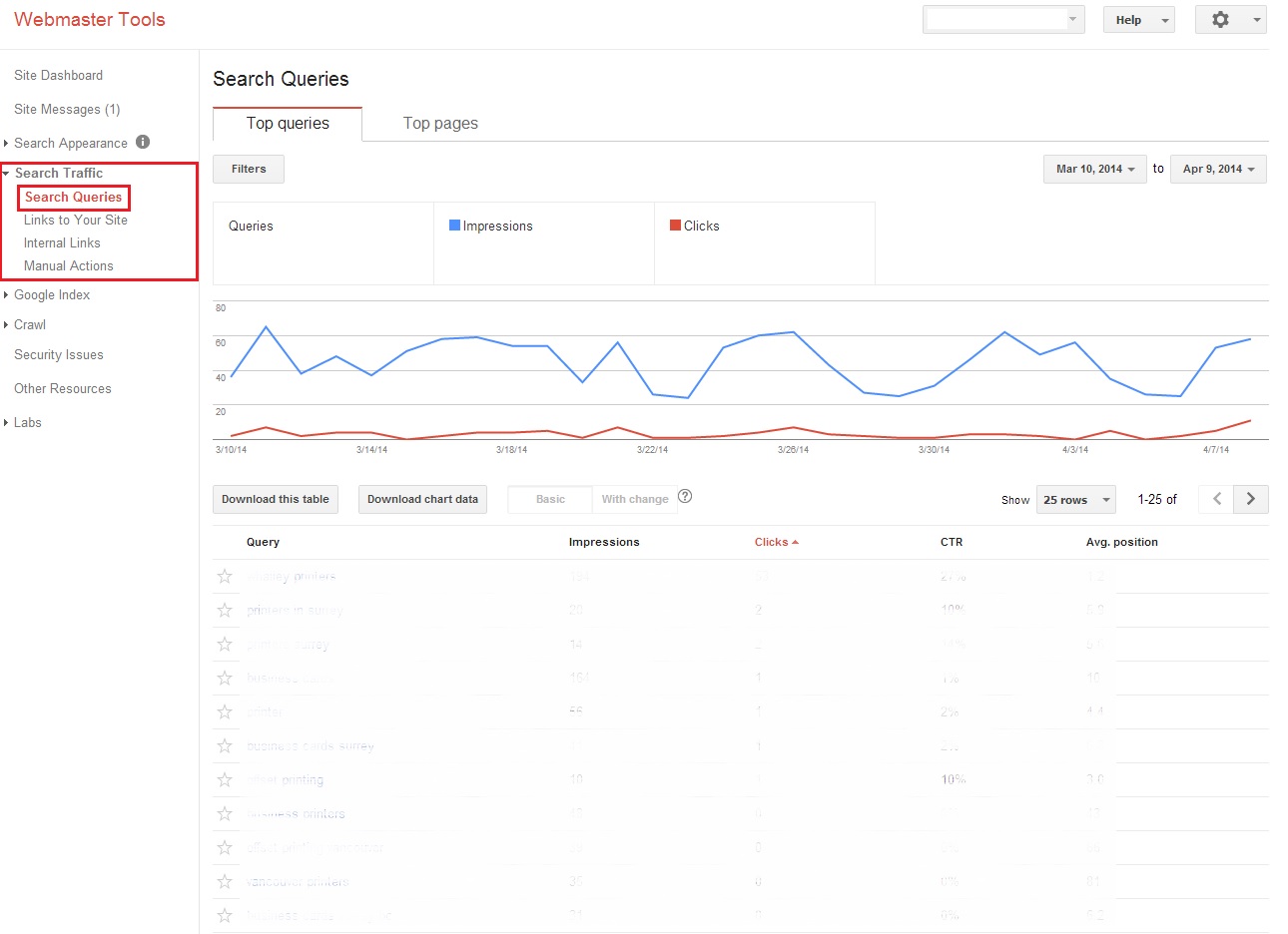 As stated by Google, the Search Queries report in Google Webmaster Tools “provides aggregate information about the top 2000 queries, each day, that generated organic clicks”, the important part of the statement being the word “organic”. How do organic clicks relate to paid clicks? Organic and paid clicks can sometimes be correlated if you are advertising for the keywords that your website ranks high for, but other than that this report actually does not provide any valuable information when it comes to your Adwords campaigns. And if you are advertising on the keywords you struggle to organically rank for, this report is totally unrelated. The report is accessible in Search Traffic > Search Queries, as seen below: