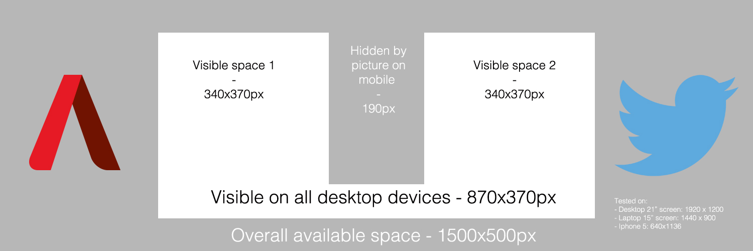 When testing the new Twitter web profile we realized that the 1500x500px banner is actually cropped quite a lot, depending on the device used to access Twitter. We decided to test the new Twitter banner on the following resolutions: