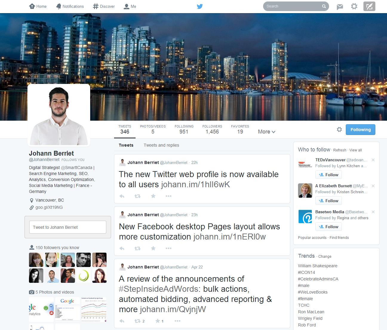 Twitter announced Tuesday afternoon on its blog that the new web profile design is now available to all users. For references, here is what the new web profile looks like: