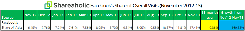 - Facebook’s share of visits increased by 47.44% from October to November 2013The chart above has been turned into a graph for an easier read: