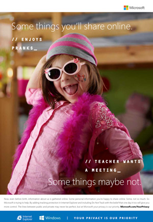 Microsoft's new ad campaign focuses on user privacy, appealing to customers' desire to control what information they share on the web. The campaign contrasts Microsoft against Google, which has come into conflict with the US and European authorities recently over privacy violations. Adweek reports Microsoft's timing is prescient: This campaign comes as the advertising industry is facing criticism from the US Senate over it's failure to live up to voluntary online tracking standards.